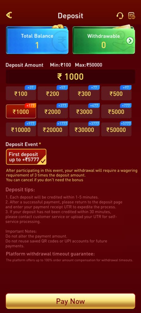 And I have also deposited ₹1000 in it first, so I got 2× bonus for free and after playing the game I made minimum withdrawal of ₹110, so it came within 1 to 5 minutes.