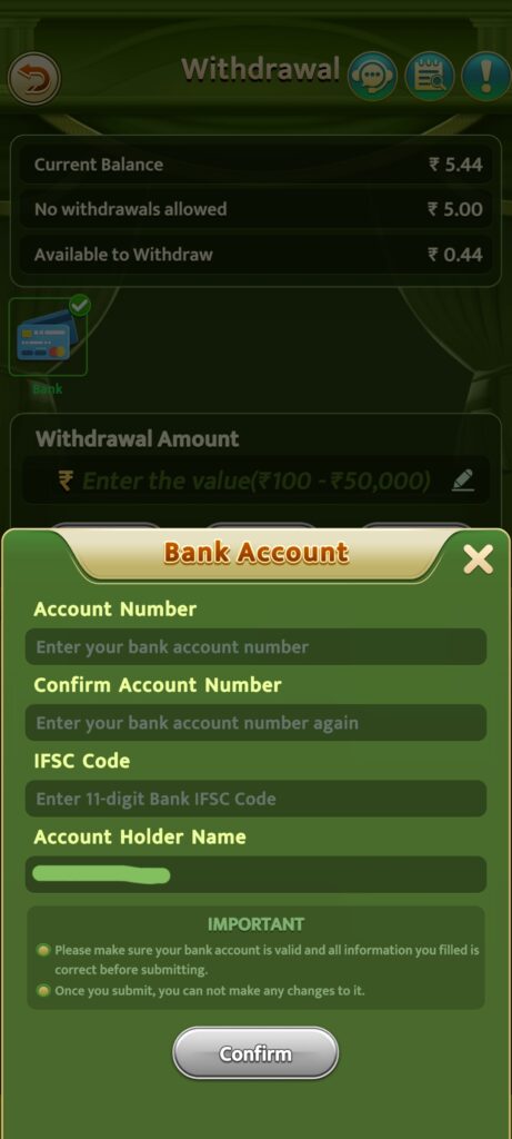 To add bank account in MQM Bet App first make deposit minimum deposit is ₹50 and maximum is ₹20000 and play games and win money, add account to withdraw.
